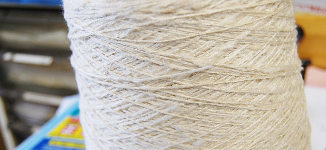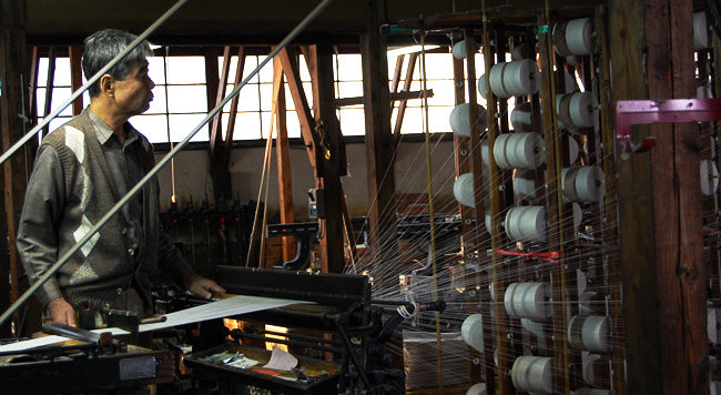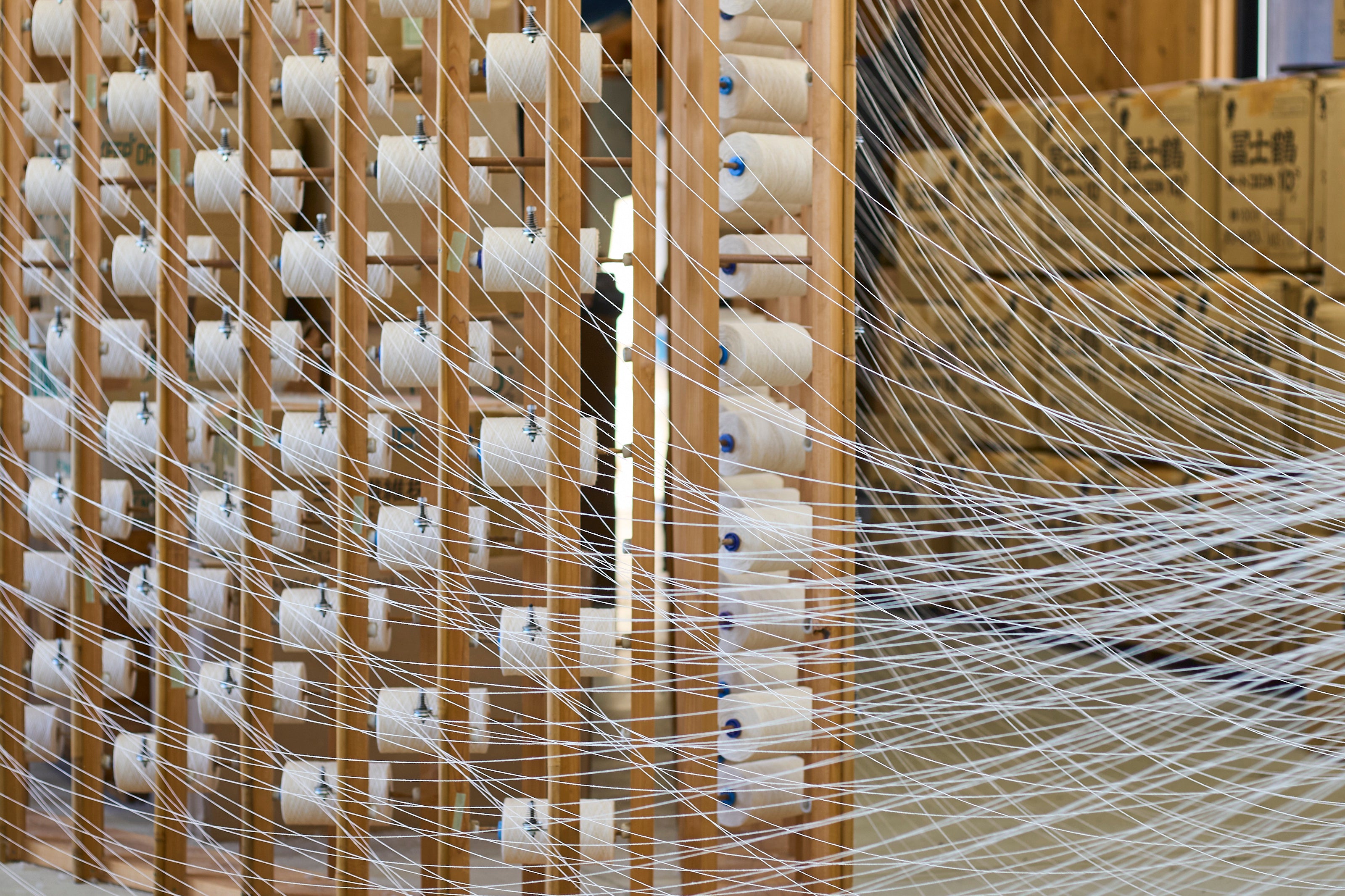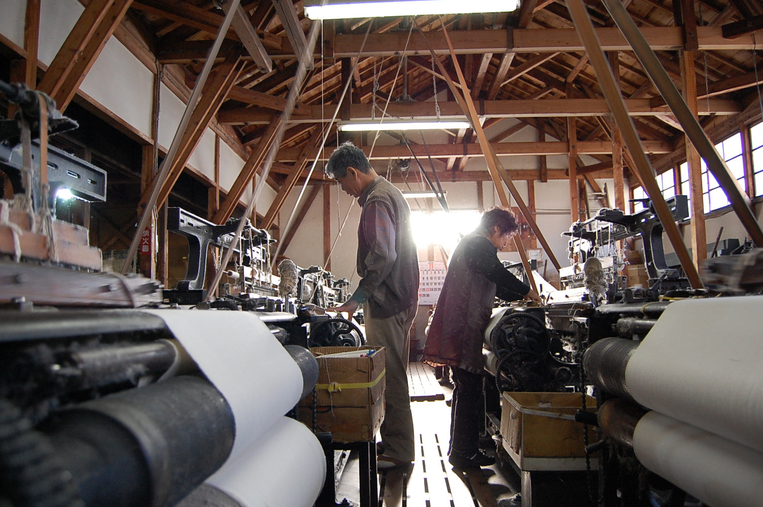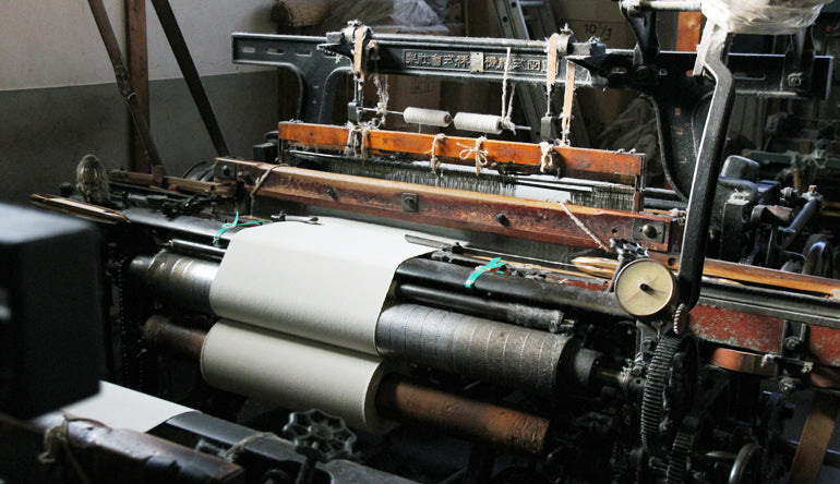 →明治~大正に発明された「シャトル織機」を使い、昔の前掛け本来の厚みをを現代に蘇らせた'1号前掛け'。面の糸番手で言うと「1.5番」の太さの糸を使い織っています。「ぶ厚い」と「柔らかい」という、一見反することを同時に実現しているのも、芳賀氏直伝。厚く、長持ちする生地、それが最大の特徴です。